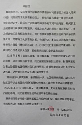 恳请领导能够彻查村霸胡玉礼及背后的保护伞,我所举报都是事实,有视频为证!如有不符愿负法律责任!