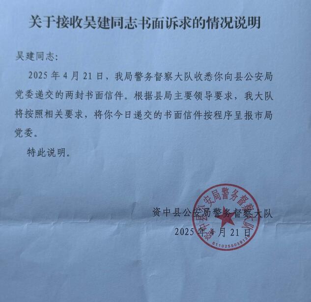 根据吴建的讲述,颁奖大会后,杨绍文对其表示,要将比尔金店案拍成电视剧,并安排了一场饭局,让其与西安影视公司的负责人吃饭、喝酒,“杨绍文要我配合写剧本,把关写的案子,还要我在资金上予以配合。”吴建在举报材料中说,饭局由杨绍文组局,参与人员有内江市中区公安局政委虞驰、内江市公安局政保支队政委赵曼力(女)、两名女警等及两名影视公司负责人等。吴建本人讲述,他因对投资拍摄电视剧一事并无兴趣,多次婉拒;及至《大地》剧本写完,他也没有答应投资,“没想到因此得罪了杨局长。”作为一名退休警察,吴建为何会拥有足以投资电视剧的巨额财富?对此,知情人士向笔者介绍,吴建的前妻自上世纪90年代即开始经商,通过合法方式积累了大量财富;2010年,夫妻二人因感情不合而离婚,吴建通过夫妻共同财产分割,获得了上千万元资产,并在退休后以其作为一些合法经营活动的启动资金。“吴建的财富,是依法获得的。他退休后较为富有这个事实,也在内江公安系统人所共知,根本不存在任何违法违纪的问题。”知情人士说,令人没想到的是,吴建的合法财富,早已被他人给盯上了。04被投诉“违法调查”后内江警方“秒抓人”拒绝出资拍摄“局长宣传剧”后不久,内江警方“恰好”收到了针对吴建的举报。警方很快成立了专案组,对吴建展开调查。知情人士介绍,专案组组长正是不久前与吴建一起参与杨绍文饭局的内江市中区公安局政委虞驰。丁三说,电视剧项目于2024年3月因资金问题烂尾,不久吴建就被调查,从时间上看,“很巧合。”吴建在其材料中称,他被一名曾经的生意伙伴陈某金起诉“返还借款3477万元”,“意图对我索要钱财。在我出示原始凭证后,他只能自己撤诉。结果,此人气急败坏,四处捏造罪名举报我。”吴建说,约从2024年6月开始,内江警方成立了专案组,在未对他立案的情况下,展开了持续11个月的调查;作为一名老刑警,他一眼便看出了相关调查的诸多违法违规之处。