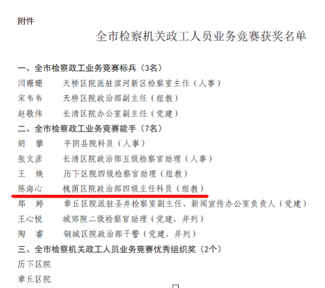 山东济南市槐荫区检察院干警被评为 “全市检察政工业务竞赛能手”