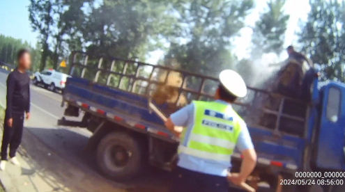 5月24日上午9点,临沂市公安局交警支队费县大队新庄中队民辅警巡逻中,行至新庄镇朱家茧坡村路段时,发现对面路边停了一辆蓝色货车,货车车厢里正冒着浓浓的黑烟,还有明火。货车后边站着一名男子,可能是货车驾驶员,面对突发火情,显得手足无措。火借风势将会迅速蔓延。由于该路段是国道,过往车辆尤其是大货车很多,如果不及时处理,势必会造成道路拥堵甚至引发交通事故。