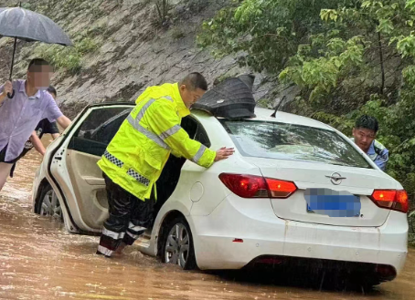 山东省费县:轿车过水被淹没巡逻队员及时伸手救援