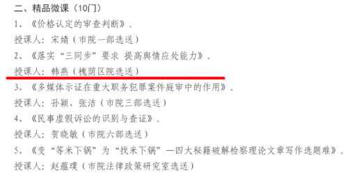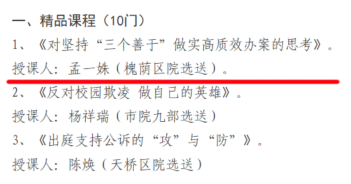 山东新闻网:为贯彻落实全市检察长会议精神,进一步加强全市检察教育培训课程建设,优化培训资源,带动检察教育培训质量水平整体提升,7月至9月济南市检察院在全市检察机关开展了精品课程、精品微课的评选工作,槐荫区检察院第四检察部孟一姝主讲的课程《对坚持“三个善于”做实高质效办案的思考》获评全市精品课程,办公室韩燕主讲的课程《落实“三同步”要求 提高舆情应处能力》获评全市精品微课。(济南市槐荫区检察院)