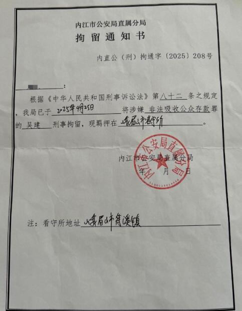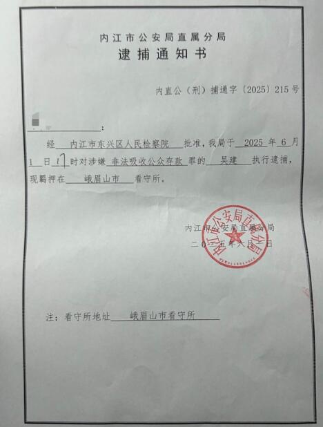“在从未对我立案的情况下,警方收缴了我的因私护照、港澳通行证;以‘故意伤害案’传询我本人多达7次,但询问内容与故意伤害案没有任何关联。”吴建说,其多名亲属亦遭传询,某些办案人员在调查询问时,违法违规威胁、诱导被询问人员。不胜其扰之下,吴建于2025年4月21日向内江市公安局等机构递交了《关于本人吴建及亲朋好友被内江市公安局个别警察违法违规违纪调查长达11个月的情况反映》。在该材料中,吴建指出其遭到个别警察涉嫌非法限制人身自由、对其非法采取侦查技术手段等情形,“我恳请上级机关对有关专案组调查的合法性以及违规行为予以调查,同时恳请上级机关和领导尽快给我一个合理、公正的调查结论。”知情人士向笔者介绍,递交投诉材料的当天,吴建即被内江警方以“非法吸收公众存款”刑事立案;4月24日,吴建及多名亲属被传唤;4月25日,吴建等6人被刑事拘留;6月1日,经内江市东兴区检察院批准,吴建等4人被逮捕。
