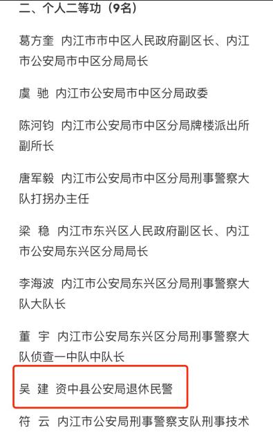 吴建本人的举报材料,则披露了这桩刑案的另一面。他说,为令这部“突出领导”的宣传剧顺利拍摄,时任内江市副市长、公安局长杨绍文多次“暗示”他出资拍摄这部拟定投资7500万元的电视剧,遭到他婉拒;他因而开罪局长,很快便受到了刑事打击报复。01功勋警察追凶21年立下二等功6月9日,有新闻媒体发布《四川一退休民警涉嫌非法吸收公众存款罪被批捕,曾被返聘协助破获重特大陈案荣立二等功》报道,披露了内江市资中县退休警察吴某因涉嫌“非吸罪”被捕的消息。笔者从知情人士处获悉,该报道中的“吴某”,即曾任资中县公安局刑警大队 大案中 队 副中队长 的吴建。吴建现年63岁;2011年,吴建因个人健康原因提前退休。据了解,吴建曾因公负伤,伤残等级评定为九级,并在2021年被评定为“伤残人民警察”。根据吴建亲属的介绍,吴建在其从警生涯中,曾获得个人二等功两次,个人三等功五次,是闻名内江警界的功勋警察。笔者经检索获悉,关于吴建的最新官方消息,记录于2023年6月29日内江市公安局官方账号发布的《内江市隆重举行侦破重特大陈案颁奖大会》文章中。