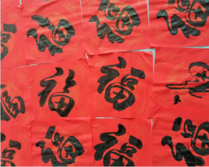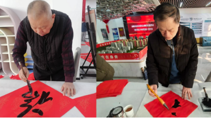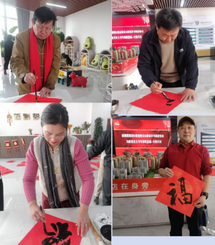 活动现场聊城市书画家协会主席团艺术家们现场发挥写作、,大家情绪高涨、笔酣墨饱、挥毫泼墨,百余幅寓意吉祥、喜庆的“春联”和几百个“福”字,当他们看到一幅幅散发着清新墨香的喜庆春联跃然纸上。新鹏都集团&雅冠物业领导员工们一边欣赏着漂亮的书法,一边忙着晾晒油墨未干的春联,整个现场洋溢着新春祥和的气息,满满的春联被热情的领导职工赞不决口。馥郁的墨香在“中国红”的纸张上萦绕,浓浓的年味在此处提前映现!