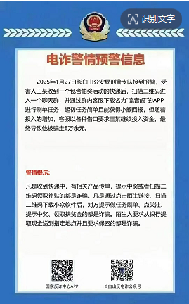 山东新闻网:(杨刚)2025年1月27日长白山公安局刑警支队接到报警,受害人王某收到一个包含抽奖活动的快递后,扫描二维码进入一个聊天群,并通过群内客服下载名为“流音阁“的APP进行刷单任务,起初任务简单且能获得小额回报,但随着投入的增加,客服以各种借口要求王某继续投入资金,最终导致他被骗走8万余元。