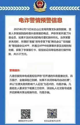 2025年2月15日长白山公安局刑警支队接到报案,受害人李某接到自称是抖音客服的电话,声称李某开通了抖音会员,如果不及时关闭的每月要扣除800元。当李某要求关闭时,所谓的“客服“诱导李某下载“腾讯会议““"在线服务“等视频会议APP,并通过APP中的屏幕共享及远程控制功能,获取了李某银行卡、短信验证码等信息进行操作转账,共计27万元。