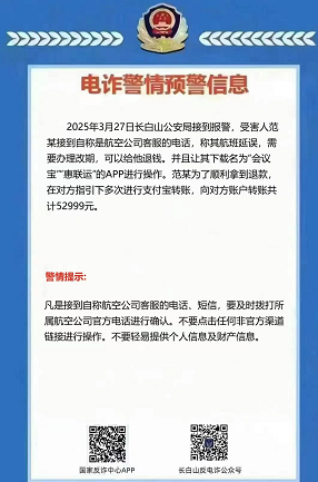2025年3月27日长白山公安局接到报警,受害人范某接到自称是航空公司客服的电话,称其航班延误,需要办理改期,可以给他退钱。并且让其下载名为“会议宝”“"惠联运”的APP进行操作。范某为了顺利拿到退款在对方指引下多次进行支付宝转账,向对方账户转账共计52999元。