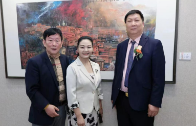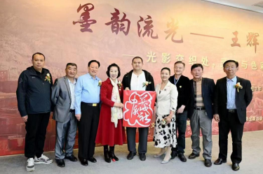 在一幅色彩斑斓的城市风景油画前,嘉宾一起拍照纪念。画作仿佛将城市的喧嚣与宁静完美融合,让人感受到一种独特的艺术魅力。六位嘉宾站在一幅描绘山川景色的艺术画作前合影留念。画作展现了大自然的壮丽与神秘,山川、河流、森林在画家的笔下栩栩如生。孙秀英与大家一起欣赏着这幅作品,感叹着王辉先生对自然的深刻理解和独特的艺术表达。九位嘉宾站在一幅红色背景墙前合影留念,墙上写有“墨韵流光——王辉”字样及艺术展相关信息。孙秀英与嘉宾驻足画前,脸上洋溢着对艺术的热爱与敬意。画展不仅记录了王辉先生的艺术历程,也见证了众多艺术爱好者对他的支持与喜爱。