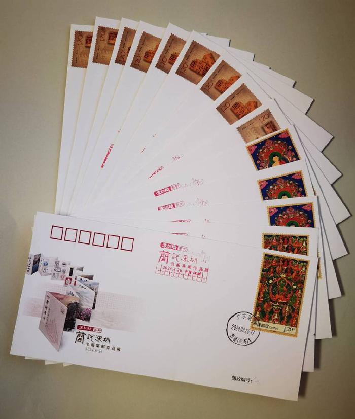 展出的邮集则由陈健和梁仲楷提供。内容分别有“吴巍简帛书法艺术”(5框)、“诗画深圳”(1框)、“诗话吴巍简帛”(1框)、“深圳邮品上的简帛书法”(3框)、“千园之城——深圳”(4框)、“荔香晨曦”(1框)以及陈健于2019年6月参加武汉世界邮展的“诗意*书*画*邮”(5框)。同时,还展出了从2003年至2024年20多年来在北京、深圳、南京所举办的集邮、书画活动中所设计的、含简帛书法文字的纪念戳达到28枚。