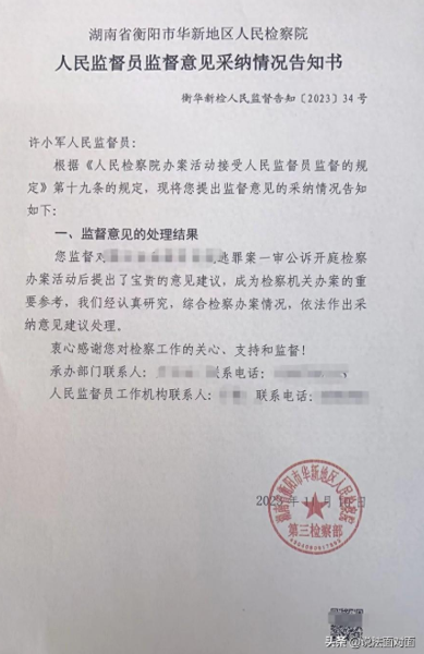 邀请人民监督员监督检察官出庭公诉活动,既有助于进一步促进检察机关依法规范办案,更能够助推检察办案提质增效。下一步,衡阳市华新地区检察院将继续扩展群众了解检察工作的渠道,保障了人民监督员的参与权、知情权、监督权,真正做到检察机关在司法办案中的公开、公平和公正。