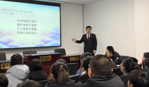 在法治副校长的引导下,同学们先后参观了青少年法治教育中心、家庭教育指导站及少年法庭等场所建设,了解了各个场所的职能分工及工作情况。法治副校长用通俗易懂的语言向同学们讲解了法院的职能作用、工作流程以及天平、法槌所象征的意义。与此同时,结合电信网络诈骗的真实案例,法治辅导员以讲座的形式为同学们上了一堂法治公开课,安排大家扮演法官、公诉人、被告人、辩护人等角色,以模拟法庭形式使同学们身临其境感受司法的公正和法律的威严,进一步增强了同学们对法律的崇尚与敬畏。