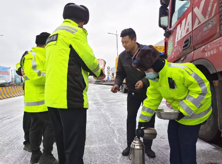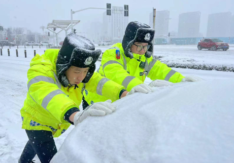 爱心融冰雪,守护传温情。在大雪纷飞里,临沂交警全警动员奔走在服务群众最前沿,他们引导车辆、撒盐除雪,用锹铲、手推等方式帮助被困车辆,为被困司机送开水、送食物……,用自己的温暖守护传递着交警的忠诚与温情,让群众切实感受到雪“警”怡人,暖心如故。(临沂市郯城交警大队)