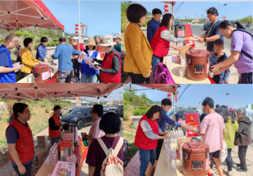 同样,在博山陶琉大观园,博山区总工会志愿服务流动驿站也成为一道靓丽的风景线。“请问卫生间在那里?”“孩子太小,不能喝凉的,有温热的水吗?”“附近哪里的烧烤好吃?”为游客提供纸巾热水、交通引导、信息咨询、志愿讲解、文明劝导......志愿者们用微笑和行动为游客提供了热情周到的服务。