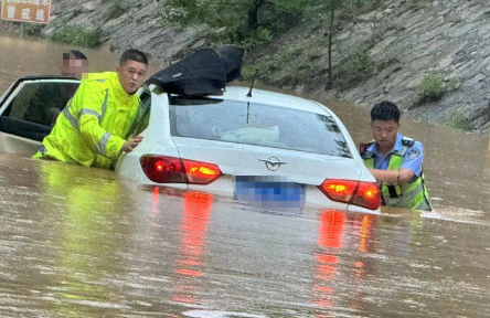 山东省费县:轿车过水被淹没巡逻队员及时伸手救援