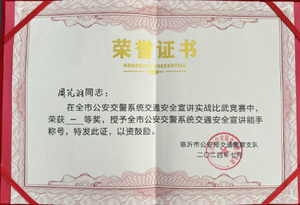 经过初赛和决赛的激烈角逐,裁判组综合评定,周芃羽荣获交通安全宣讲实战比武竞赛一等奖,被授予“全市公安交警系统交通安全宣讲能手”称号。